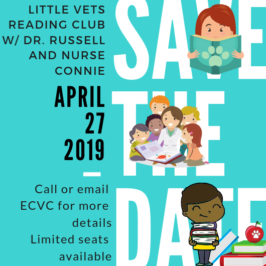 Don't forget to register! June's Little Vets Reading Club is coming up fast. Join Dr. Russell and Nurse Connie for a hour of reading, pet news, and responsible pet ownership "dos and don'ts", Saturday June 29th! Seats are limited, children must be accompanied by a parent. Please call or message us to reserve your seat! … Continue reading ECVC’s Next Little Vets June 29th